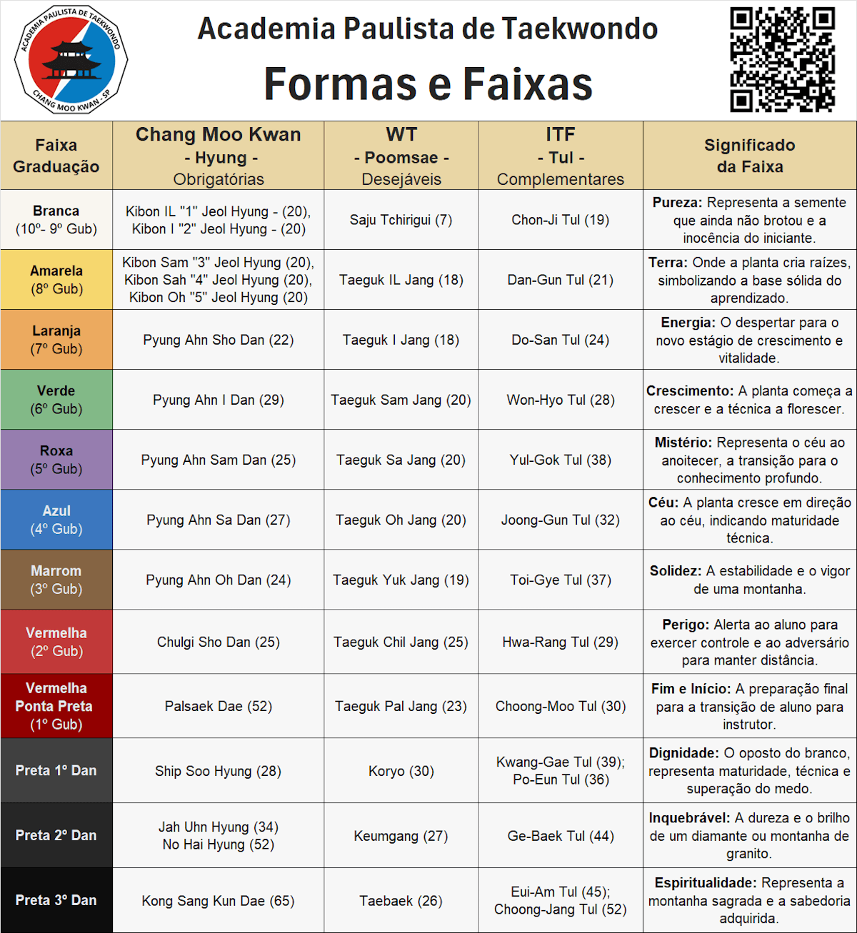 As formas oficiais da WT são chamadas de Poomsae, com destaque para a série Taeguk, praticada ao longo das faixas coloridas.